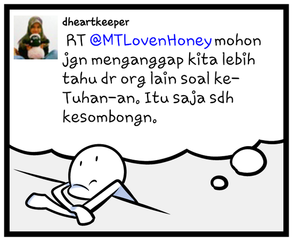 @MTLovenHoney: Dan mohon jangan menganggap kita lebih tahu dari orang lain soal ke-Tuhan-an. Itu saja sudah kesombongan.”Thanks. Twitter will use this to make your timeline better. UndoUndo