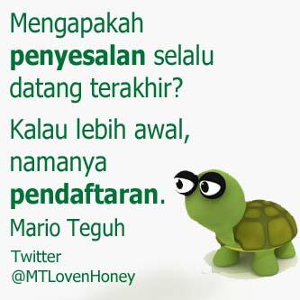 @MTLovenHoney: Mengapakah penyesalan selalu datang terakhir? Kalau lebih awal, namanya pendaftaran. Mario Teguh htThanks. Twitter will use this to make your timeline better. UndoUndo