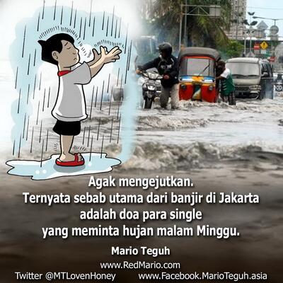 @MTLovenHoney Agak mengejutkan. Ternyata sebab utama dari banjir di Jakarta adalah doa para single pic.twitter.com/2bRC4vOjAv"