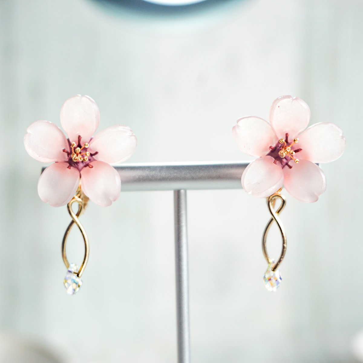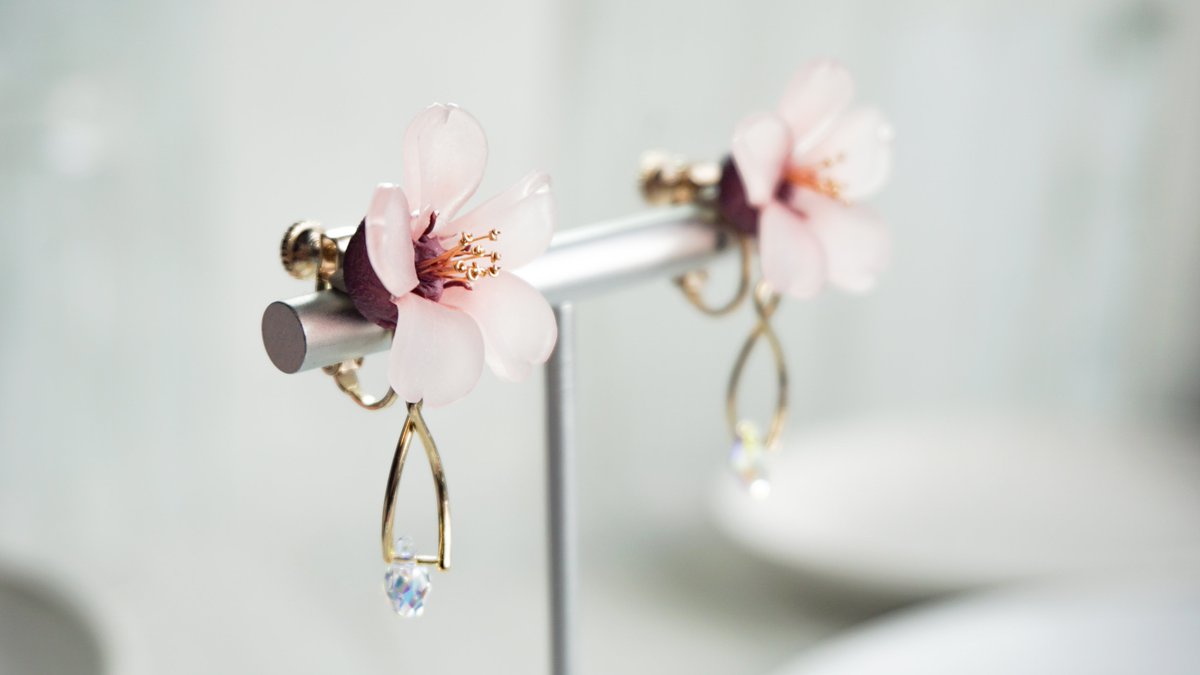 桜の耳飾り(下がり付き)できたよー! プラバンの桜のしっとりとした透明感と、スワロのキラキラ感が良い感じ