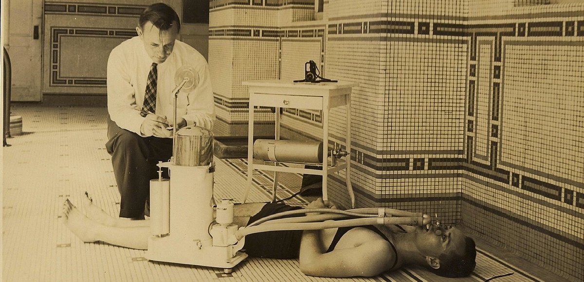 This 1930s-era photo features a swimmer having his pulmonary function evaluated by the poolside.