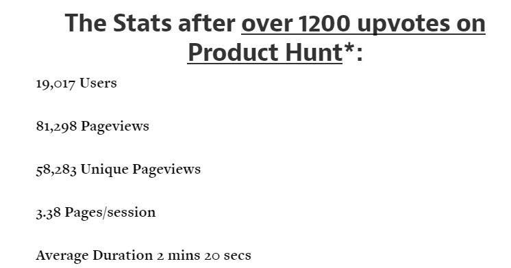 1 week after launch. The stats: 1200+ upvotes, 19k Users, 81k Pageviews, 58k Uniques https://medium.com/@bentossell/product-hunt-launch-on-my-birthday-3d8a8da6ba96 …pic.twitter.com/24vJajSUaX