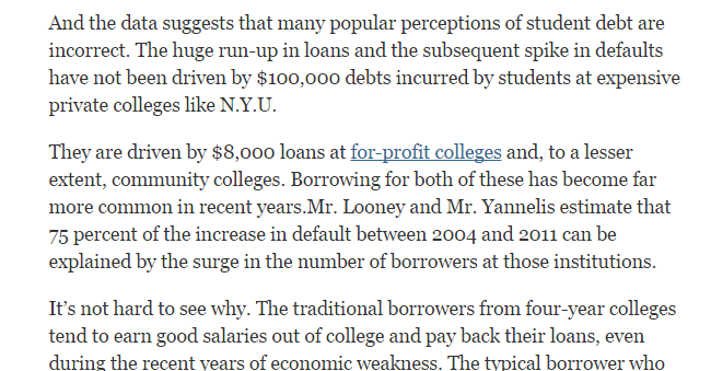 Anecdotes of MFA grads with 200K debt aside, here's data; Student loan rise driven by for-profits & comm. colleges.pic.twitter.com/ANNT2gCCfQ