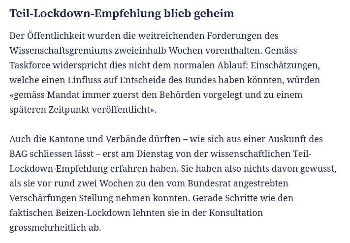 Heikle Konstellation: Einschätzungen der wissenschaftlichen Covid-Taskforce werden wochenlang geheim gehalten, bevor die Öffentlichkeit davon erfährt. Die Kommunikationspolitik des Bundes rund um die Taskforce ist m.E. nach wie vor ein Fehlkonstrukt. https://www.tagesanzeiger.ch/taskforce-bekraeftigt-forderung-nach-einem-teil-lockdown-743547767923 …pic.twitter.com/c6hny9XntT