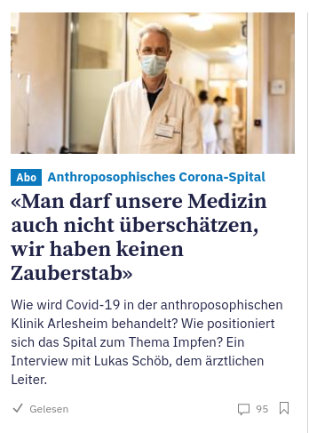 Der ärztliche Leiter der anthroposophischen Klinik Arlesheim findet, Anthroposophie sei kein Zauberstab. Das stimmt. Wenn man Patient*innen u.a. verspricht, dass sie sich gesund tanzen können, ist das nicht Zauberei, sondern esoterischer Hokuspokus. https://www.tagesanzeiger.ch/man-darf-unsere-medizin-auch-nicht-ueberschaetzen-wir-haben-keinen-zauberstab-122794009082 …pic.twitter.com/LfdRhjQ4MQ