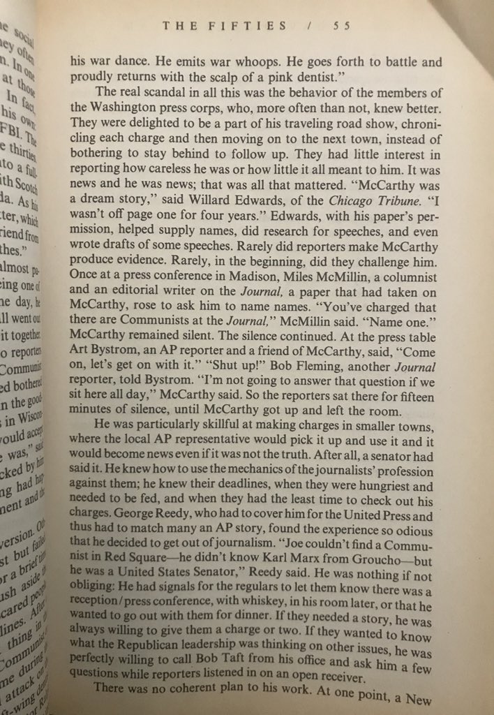 Here is David Halberstam on how Joe McCarthy played the journalists assigned to cover him pic.twitter.com/bZMaUwrDC0