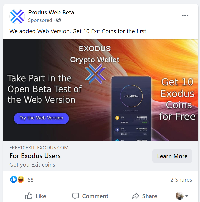 @exodus_io wallet. Facebook ads are so unsafe right now. Be careful.pic.twitter.com/6dySo6Eeh6