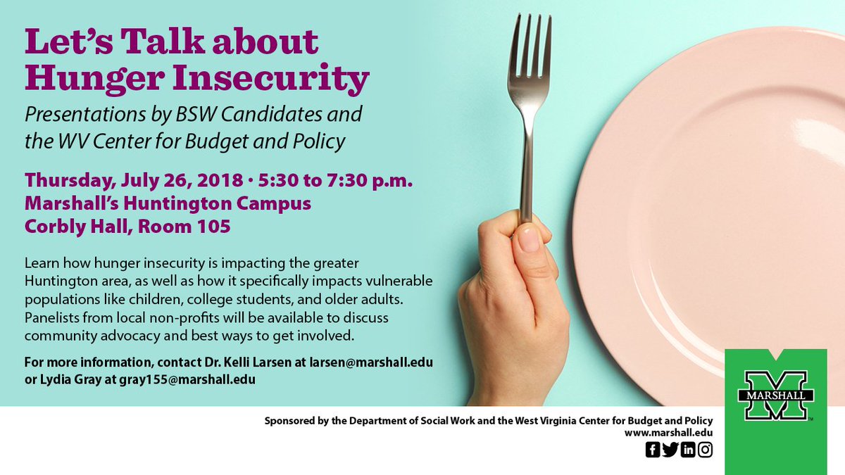Join us Thursday, July 26 to learn how hunger insecurity is impacting the greater Huntington area. Panelists from local non-profits will be available to discuss community advocacy and ways to get involved. Learn more: https://www.marshall.edu/ucomm/2018/07/18/social-work-students-address-hunger-insecurity/ ….pic.twitter.com/uZNosg4NPv