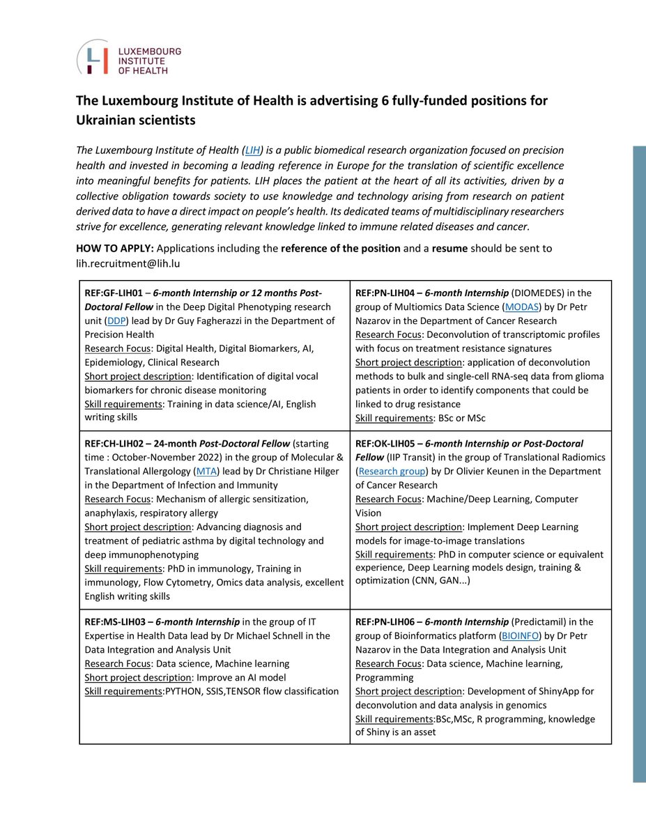 @LIH_Luxembourg supports Ukrainian scientists. They have 6 fully-funded positions in different biomedical research with a fast-track recruitment process (check: http://sciencewithukrain.eu ). Contact:@GFaghe#ScienceForUkrainepic.twitter.com/F4A7YP71PG