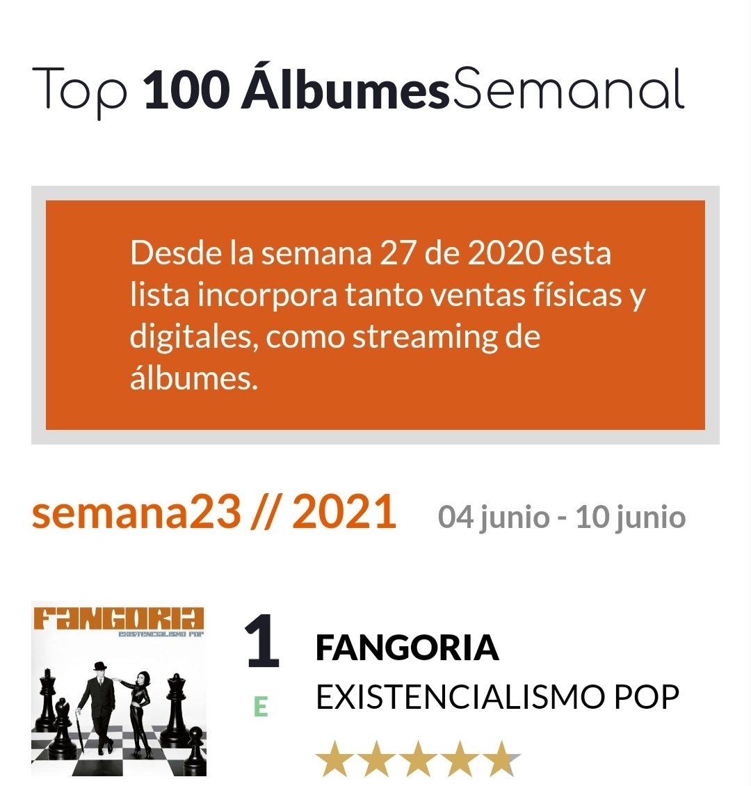 ¡"Existencialismo Pop" debuta como el disco y vinilo más vendido de la semana en España! Es el quinto número 1 de Fangoria en España, tras "Absolutamente" (2009), "Cuatricromía" (2013), "Canciones para robots románticos" (2016) y "Extrapolaciones y dos preguntas" (2019).pic.twitter.com/UXwj0fv0Bd