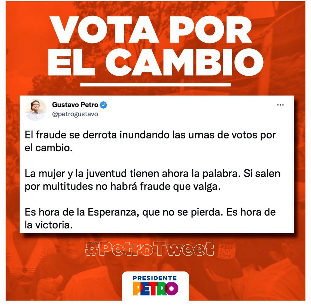 @petrogustavo como candidato presidencial. Mañana ya será Presidente de Colombia. Les pido por favor lo escuchen y repliquen masivamente.pic.twitter.com/DOSN82pTpXThanks. Twitter will use this to make your timeline better. UndoUndo