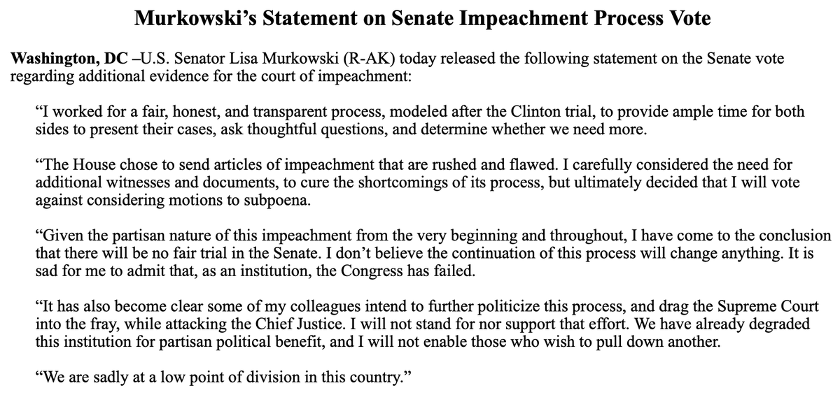 That's really the best she could come up with? That the trial--controlled by the majority party of which she's a part & requiring 67 votes for conviction--can't be fair, and therefore they're better off voting without relevant witnesses & documents? Major failure of imagination.https://twitter.com/ABCPolitics/status/1223310060664782848 …