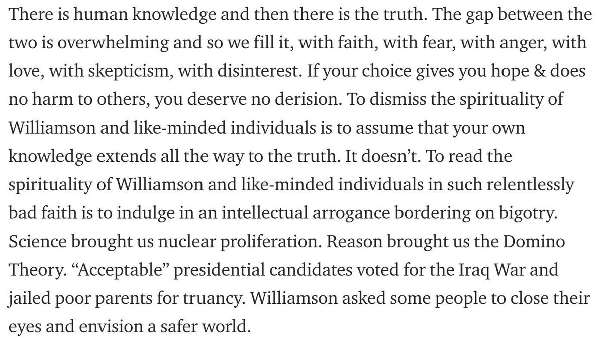 I'm not backing @marwilliamson for the 2020 election. I'm not even what one would call an overly spiritual person. But the outrage against her for her tweet regarding Hurricane Dorian has been seriously bothering me (thread).pic.twitter.com/5uzkWuPpr3