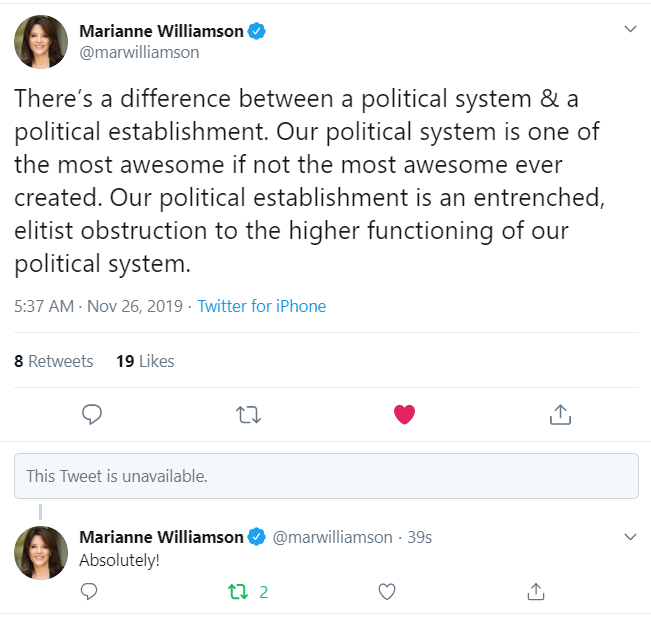 I realize this looks like this because the tweet she was responding to is private, but I legit thought for a second that Marianne Williamson was just agreeing with her own tweet.