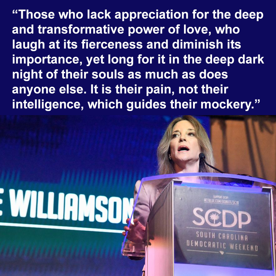 Anger is a natural reaction to what we see around us...And I feel the tug of it. But love is an option and a choice we can make. Marianne Williamson is the only candidate I see who represents that choice. That is why I choose Marianne