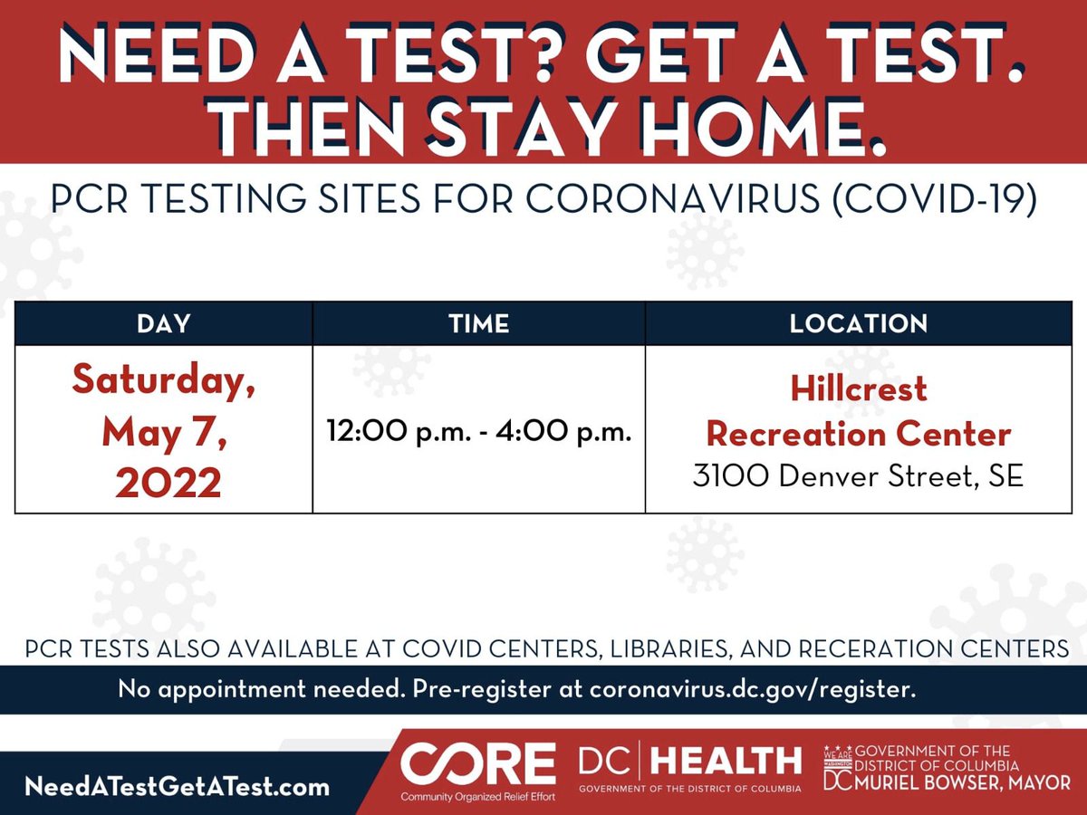 Today’s PCR testing site. Boosters available for eligible people 12+ at all sites. For at-home vaccination appointments, call 1-855-363-0333. Find more vaccine access points at http://vaccines.gov Pre-register for testing at http://coronavirus.dc.gov/register pic.twitter.com/gF9CmPKJGZ