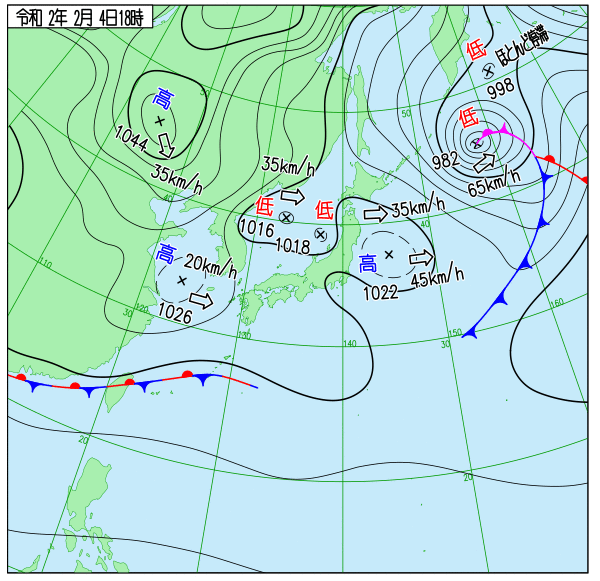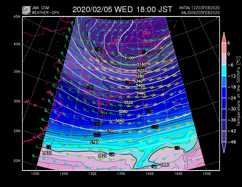 【2月4日の概況】1044hPaなう。日本海を東に進む低気圧を先陣に、本格的な寒気団進軍じゃ!大陸上では上空850hPaで約-30℃、上空500hPaで-45℃以下に仕上がったぞい!せいやー、怯むことなくゆけー、ゆくのじゃー!pic.twitter.com/CPmgU0TMfv