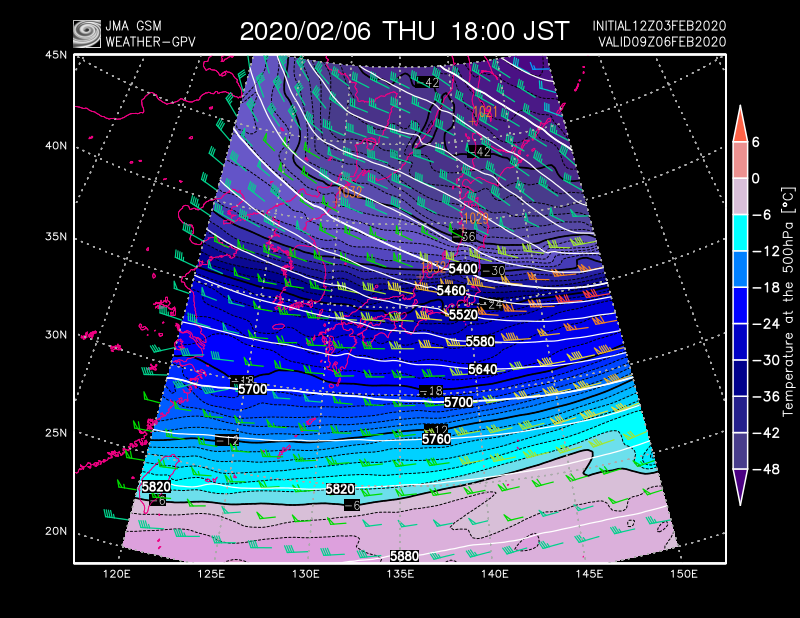 明日から明後日にかけての850hPa、および500hPaでの高層天気図。 850hPaで-6℃以下の寒気が西日本までスッポリ℃覆います。さらに、北海道には-500hPaで-40℃以下の寒気が流入。 「今季最強」の寒波がやって来ることになりそうです。pic.twitter.com/ompS9UPcBe