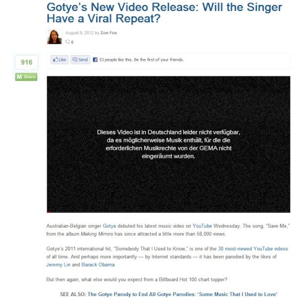 "@Gotye's New Video Release: Will the Singer Have a #Viral Repeat?" ask @mashable - Not in Germany, I guess #GEMApic.twitter.com/QeeLsgJK