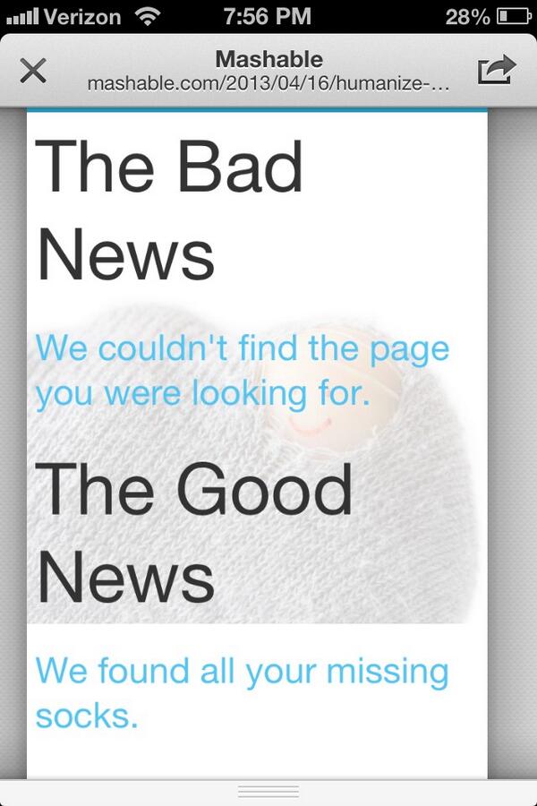 @mashable: Why Brands Should Be Human on Social Media http://on.mash.to/ZYBnjv@clickz” Funniest broken link..pic.twitter.com/5CTANq9xRU