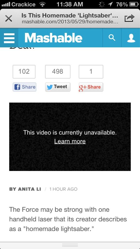 @mashable: Is This Homemade 'Lightsaber' the Real Deal? [VIDEO] http://on.mash.to/145aHAcThanks. Twitter will use this to make your timeline better. UndoUndo