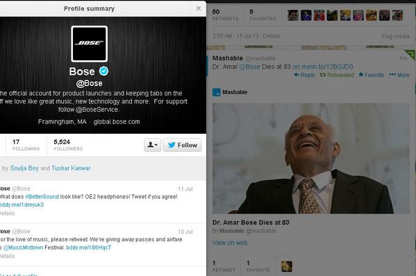 @mashable Dr Amar Bose, the founder of the Bose Corporation Passed Away not his firm@Bose http://www.bostonmagazine.com/news/blog/2013/07/12/amar-bose-died-83-mit/ …pic.twitter.com/cgUT9ulA6x