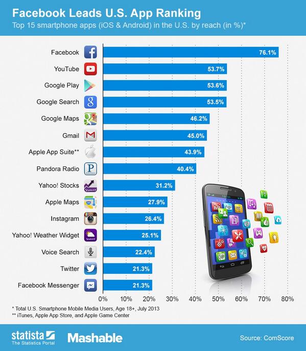 “@mashable: 76.1% of U.S. smartphone owners have downloaded the Facebook app http://on.mash.to/15YewZC pic.twitter.com/rBY13mbxl0”