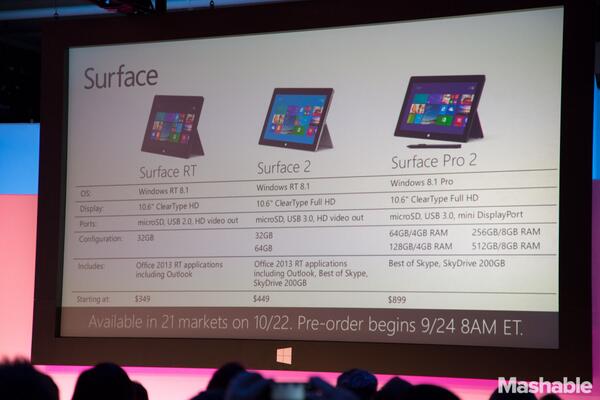 Microsoft Surface 2 and Surface Pro 2 available on 10/22. More in our live blog: http://on.mash.to/1fbHKhf pic.twitter.com/wqzg19DHwm