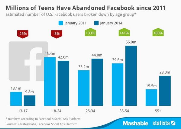 #Facebook: - 25.3% d'ados ces 3 dernières années mais +80.4% de + 55 ans http://mashable.com/2014/01/16/teens-leaving-facebook … via@mashable via@istrategylabsThanks. Twitter will use this to make your timeline better. UndoUndo