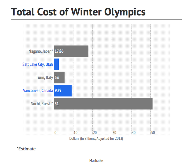 Salt Lake City, good job “@mashable: The cost of Sochi vs. the cost of past Olympics: http://on.mash.to/1fPNScZ pic.twitter.com/GvCoBaNGrF”