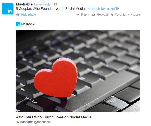 @mashable: 5 Couples Who Found Love on Social Media http://on.mash.to/1nczmRH ”Thanks. Twitter will use this to make your timeline better. UndoUndo