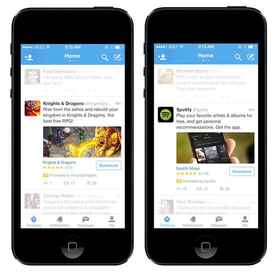 “@mashable: Mobile ads on Twitter will now promote app downloads http://on.mash.to/1neeARN pic.twitter.com/afYELs66AM” Push to monetize userbase