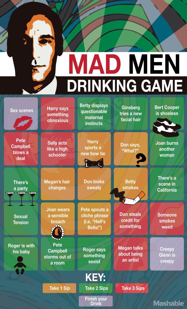 “@mashable: Enjoy this Mad Men drinking game more responsibly than its protagonists would http://on.mash.to/1jQtmu9 pic.twitter.com/TNfteaiIAA”.