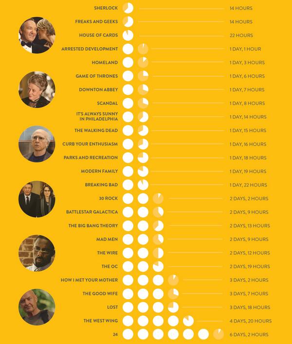 Love this! “@mashable: Binge-Watching? How Much Time You Should Budget for Each TV Show - http://on.mash.to/1nqypD5 pic.twitter.com/iauKUCt4cp”