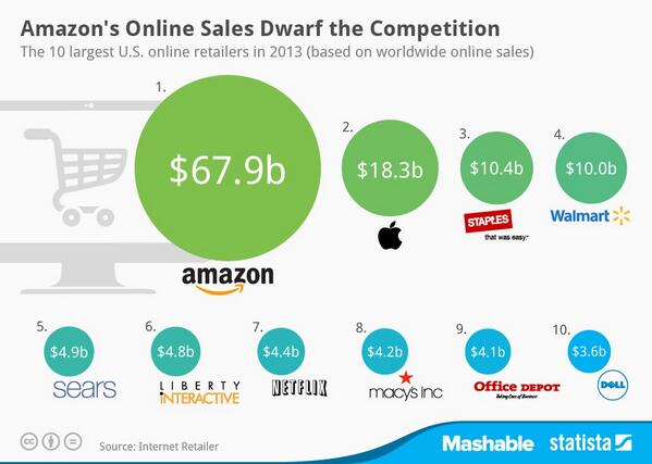 “@mashable: Amazon 3x larger than the next online retailer in 2013. http://on.mash.to/Rs0yPd pic.twitter.com/y6CYMoLbfi”