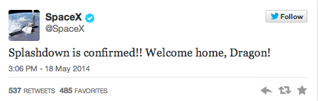 Yay! RT @mashable @SpaceX Dragon successfully returned to Earth splashing in the Pacific Ocean http://on.mash.to/1nWSvaZ pic.twitter.com/z4FfSoomEJ