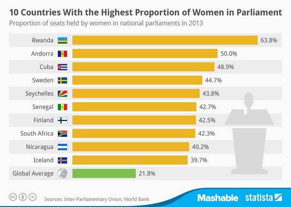 Rwanda on TOP rt @mashable The global average of women in parliament reached a record high in 2013 http://on.mash.to/1vZkM2B
