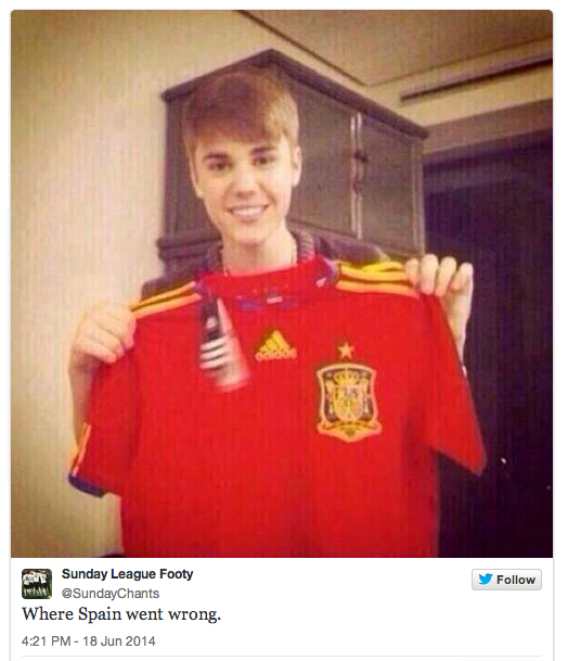 lololol RT: “@mashable: The Internet made Spain's #WorldCup loss so, so much worse. http://on.mash.to/1nRpbjL pic.twitter.com/7J9QBH3QMC”