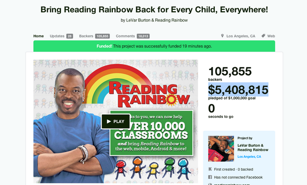 Amazing > 'Reading Rainbow' Kickstarter ends with record $5.4 million http://on.mash.to/1rk6kld pic.twitter.com/bnSFglALCs via @mashable