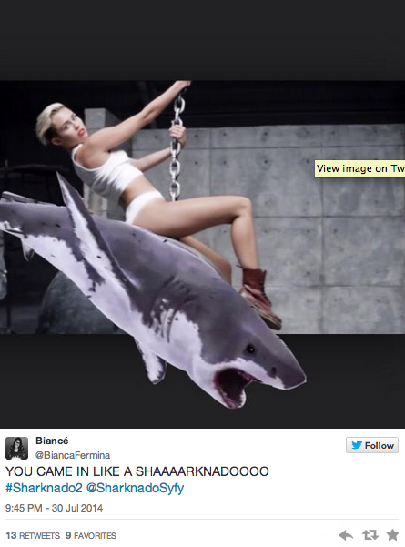 “@mashable: It's a Twitter feeding frenzy: Internet reacts to #Sharknado2 http://on.mash.to/UCnFaZ #Syfy pic.twitter.com/pyxnGHO9nm” lol