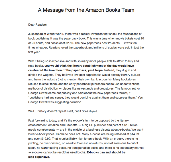 Unbelievable"@mashable: Amazon wants to enlist you in its fight against Hachette. http://on.mash.to/1nCAObj pic.twitter.com/VMForWbNAw”