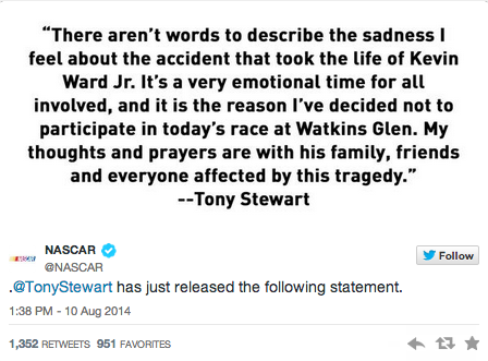 @mashable Yeah, after a good night's sleep Tony Stewart finally found his sad place & "opts" not to race. Pffft! Yeah right. He was put out.
