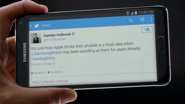 @zakajam@BrotherBon3s “@mashable: Samsung trolls iPhone 6 Plus in sarcastic new ad. Watch: http://on.mash.to/1uxO2NI pic.twitter.com/AIXjw53wMD”