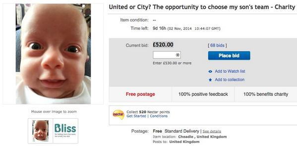 @mashable: Man U or Man City? Dad auctions infant son's soccer loyalty on eBay: http://on.mash.to/1wn51lL pic.twitter.com/kuvadhZLBw