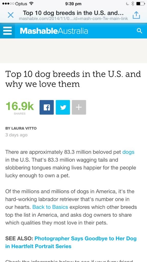“@mashable: Here are the 10 most popular dog breeds in the U.S. http://on.mash.to/1suFdiS pic.twitter.com/3gdqMNouNl”. @_jhagedorn @MisBennett