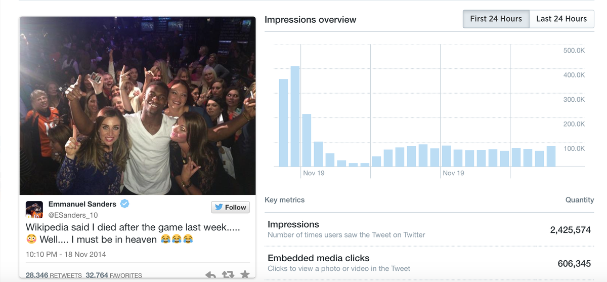 2.4M impressions RT @mashable @samcmlaird NFL star declared dead by Wikipedia wakes up... http://on.mash.to/1xDCRGe pic.twitter.com/oSLZBW7nTs
