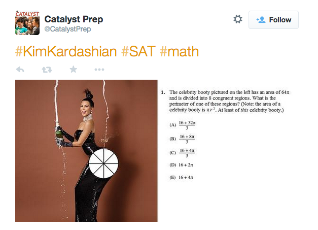 Journalism -> @mashable: Kim Kardashian's butt is now helping kids study for the SAT. http://on.mash.to/1xZOGUX pic.twitter.com/srfnErsMco