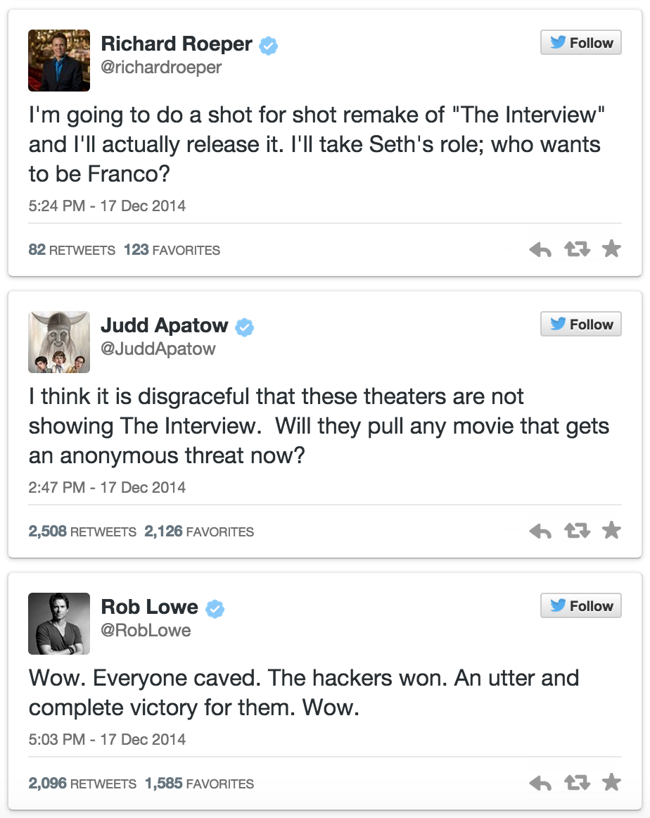@mashable 'The hackers won': Celebs are flabbergasted that Sony pulled 'The Interview' after threat http://on.mash.to/1GtzDH4Thanks. Twitter will use this to make your timeline better. UndoUndo