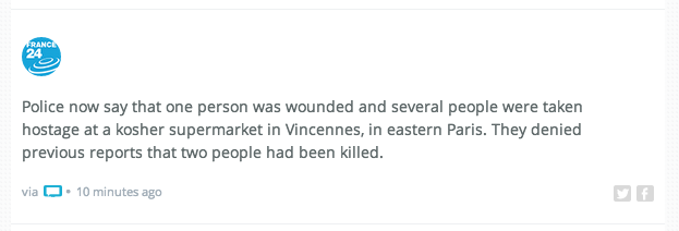 @mashable: 2 dead in hostage standoff at the kosher market in Paris http://on.mash.to/1tSV2rb "Thanks. Twitter will use this to make your timeline better. UndoUndo