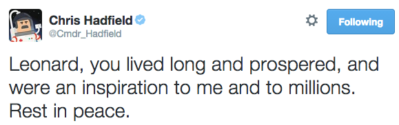 #RIPLeonardNimoy “@mashable: Astronauts remember the man who played Spock http://on.mash.to/18v4iIF #LLAP pic.twitter.com/dBsAp5AS6Y”